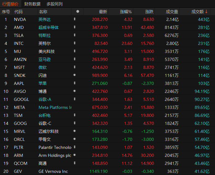第2名AMD高13.91%,成交281亿美元。受英特尔CPU业务表现超预期冲击,华尔街分析师猝不及防,AMD股价大涨。业内普遍认为,行业红利将同步传导至其他头部CPU厂商。