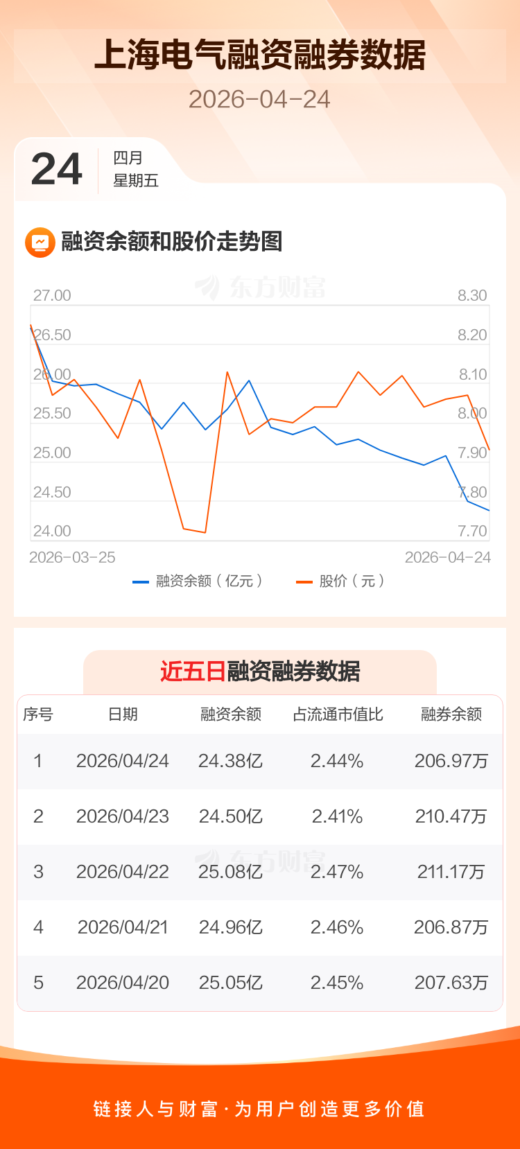 交易所最新数据显示,上海电气于2026年4月24日获融资买入5221.34万元,融资偿还6476.24万元,当日融资净偿还1254.9万元。目前,该股融资余额24.38亿,占流通市值比例为2.44%。