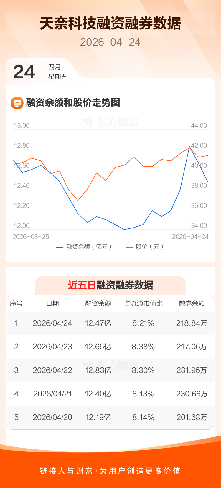 交易所最新数据显示,天奈科技于2026年4月24日获融资买入3197.12万元,融资偿还5134.56万元,当日融资净偿还1937.43万元。目前,该股融资余额12.47亿,占流通市值比例为8.21%。