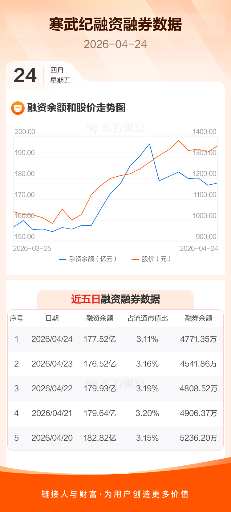 交易所最新数据显示,寒武纪于2026年4月24日获融资买入22.35亿元,融资偿还21.34亿元,当日融资净买入1.01亿元。目前,该股融资余额177.52亿,占流通市值比例为3.11%。