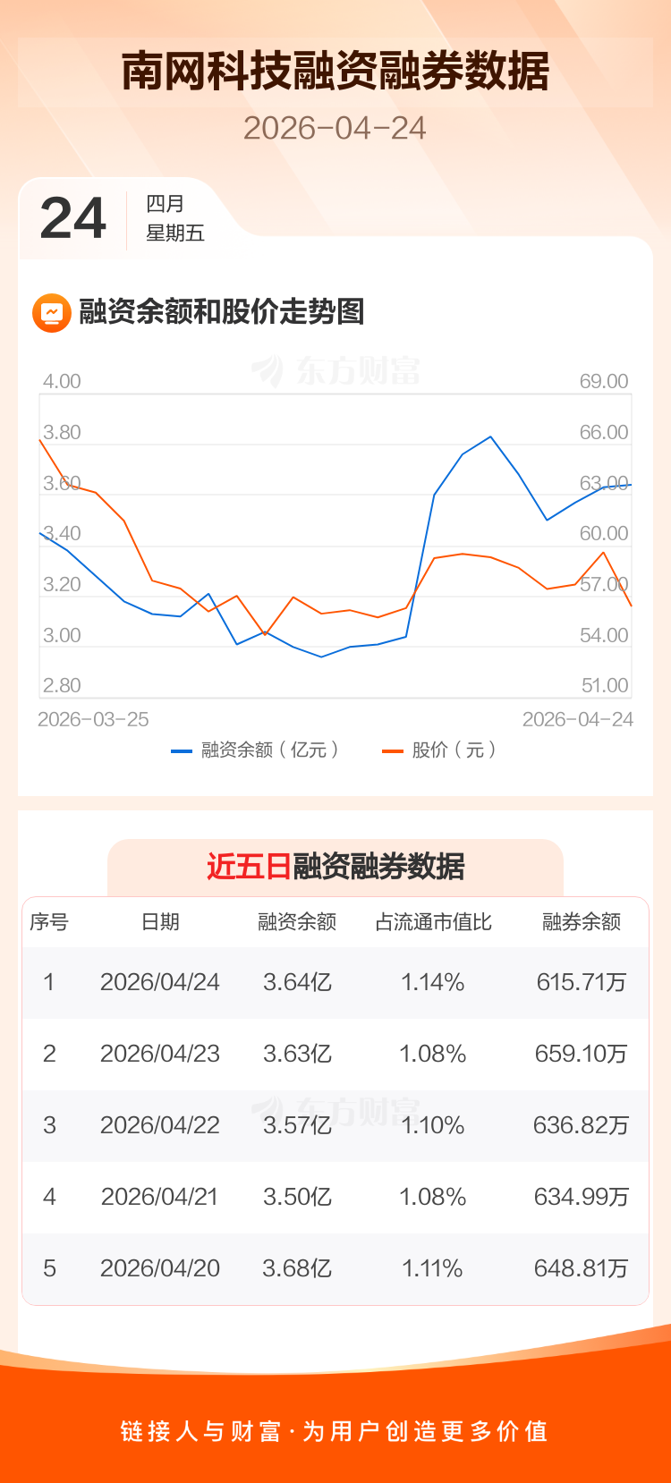 交易所最新数据显示,南网科技于2026年4月24日获融资买入4308.41万元,融资偿还4248.83万元,当日融资净买入59.58万元。目前,该股融资余额3.64亿,占流通市值比例为1.14%。