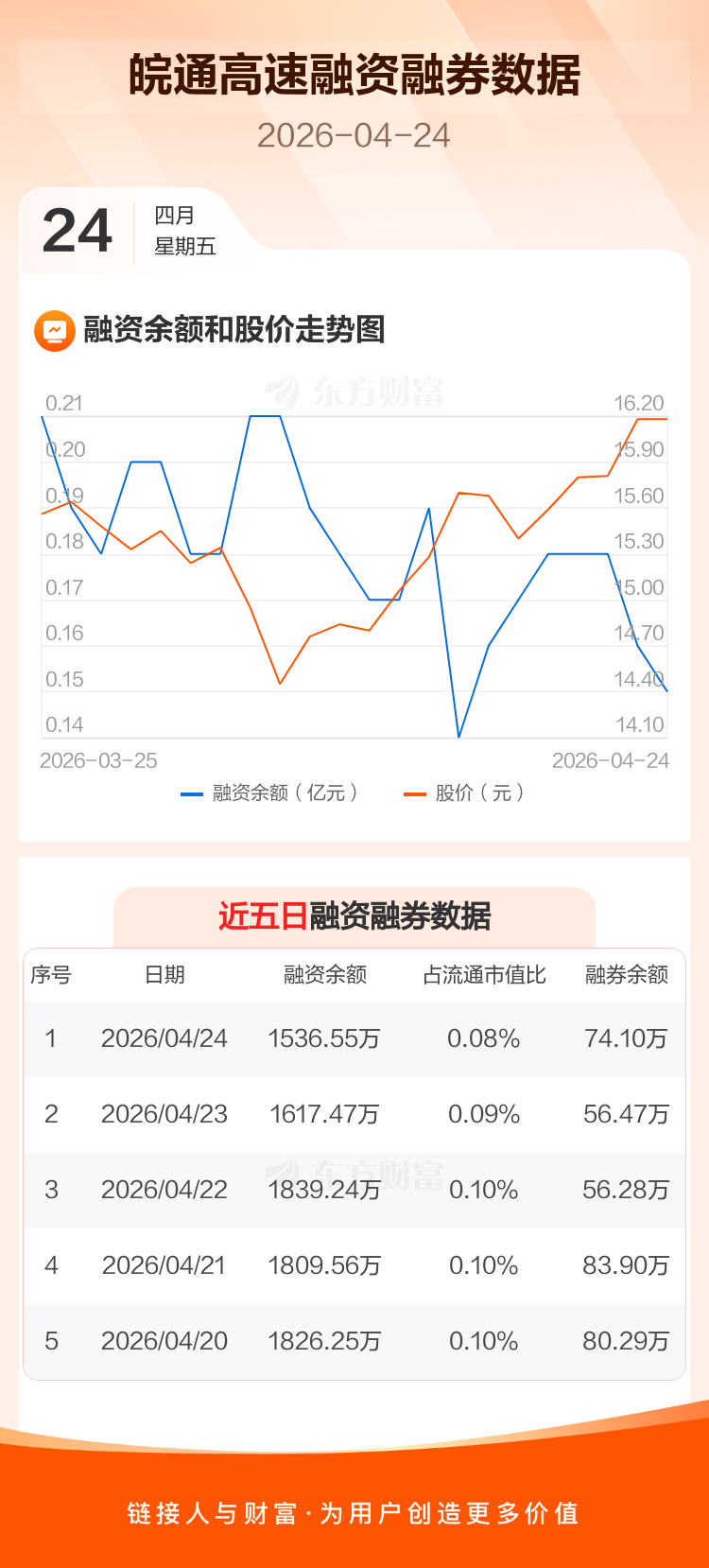 交易所最新数据显示,皖通高速于2026年4月24日获融资买入235.44万元,融资偿还316.36万元,当日融资净偿还80.92万元。目前,该股融资余额1536.55万,占流通市值比例为0.08%。