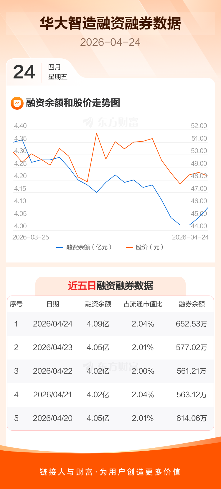 交易所最新数据显示,华大智造于2026年4月24日获融资买入1454.92万元,融资偿还1093.93万元,当日融资净买入360.98万元。目前,该股融资余额4.09亿,占流通市值比例为2.04%。