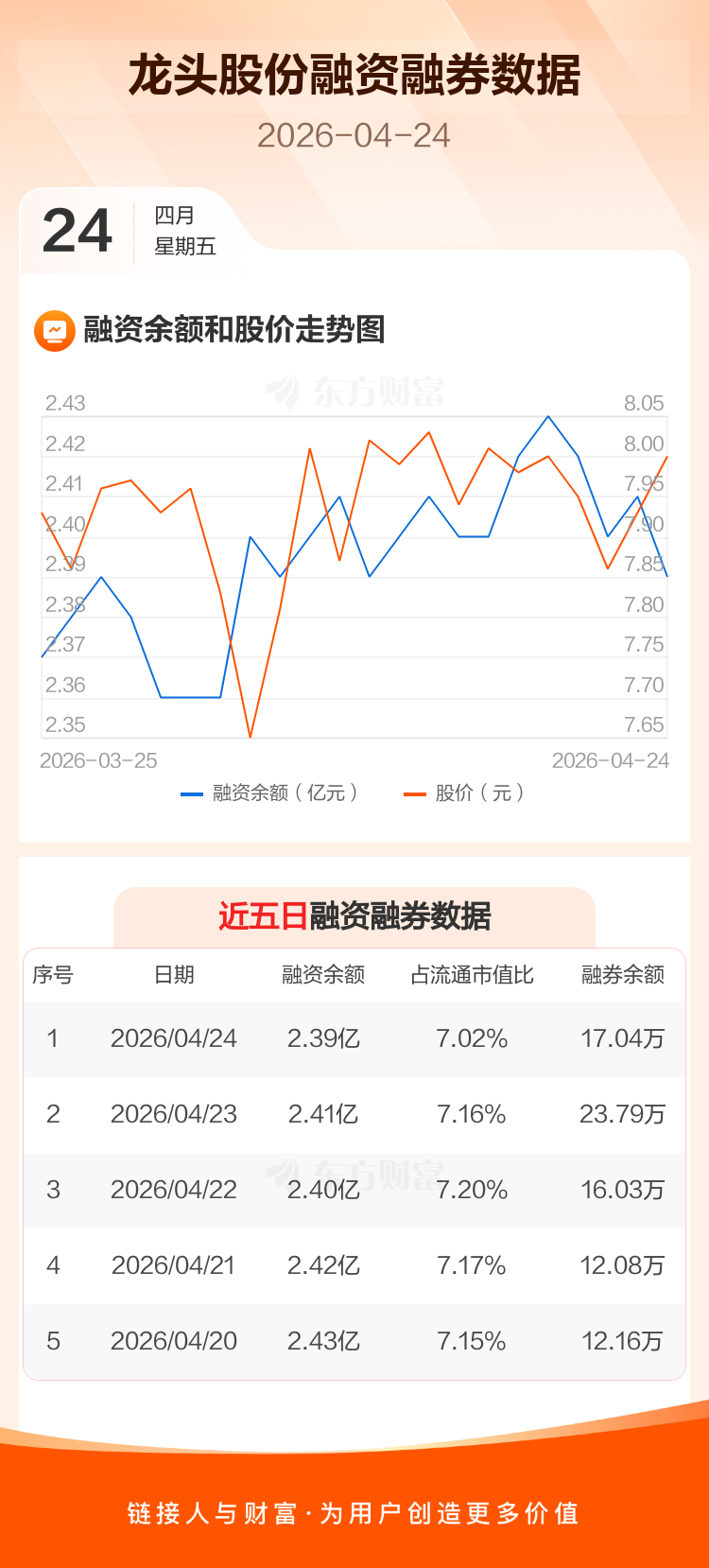交易所最新数据显示,龙头股份于2026年4月24日获融资买入387.70万元,融资偿还621.13万元,当日融资净偿还233.43万元。目前,该股融资余额2.39亿,占流通市值比例为7.02%。