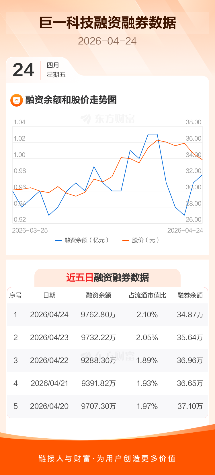 交易所最新数据显示,巨一科技于2026年4月24日获融资买入1289.66万元,融资偿还1259.08万元,当日融资净买入30.58万元。目前,该股融资余额9762.80万,占流通市值比例为2.10%。