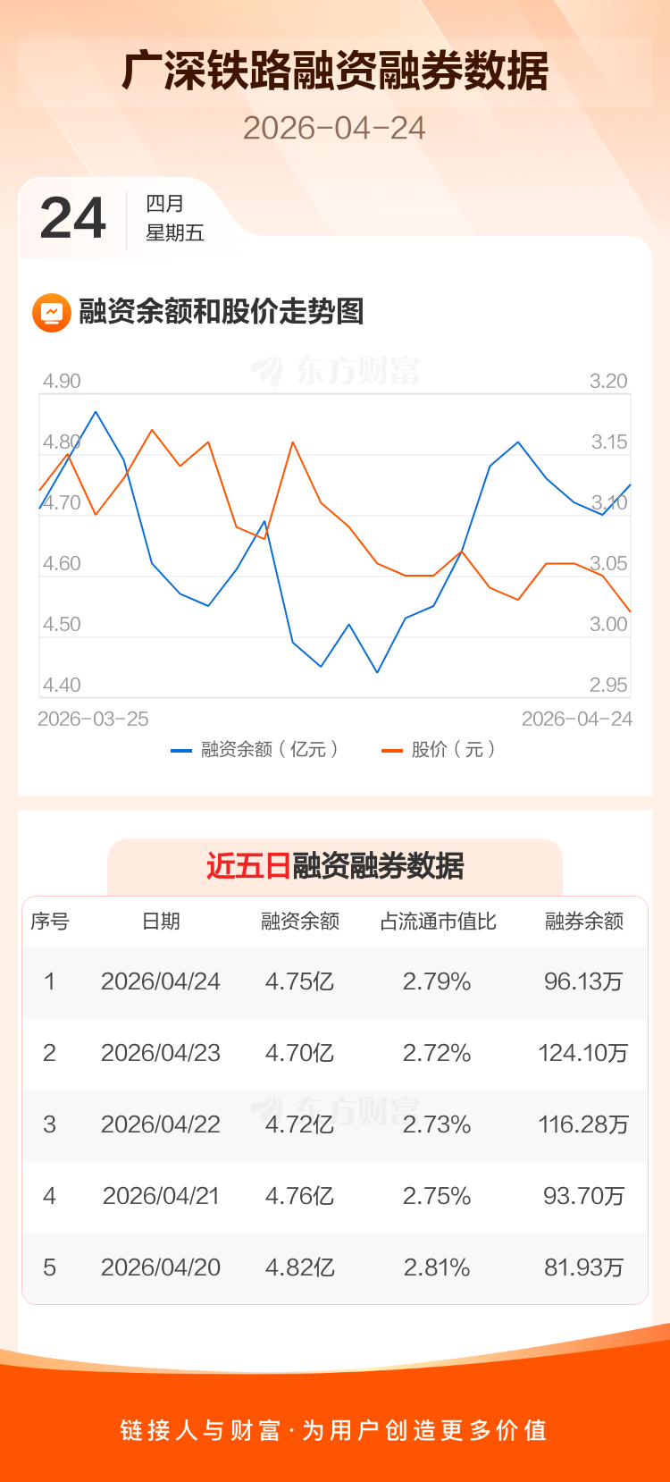 交易所最新数据显示,广深铁路于2026年4月24日获融资买入1562.09万元,融资偿还978.65万元,当日融资净买入583.44万元。目前,该股融资余额4.75亿,占流通市值比例为2.79%。