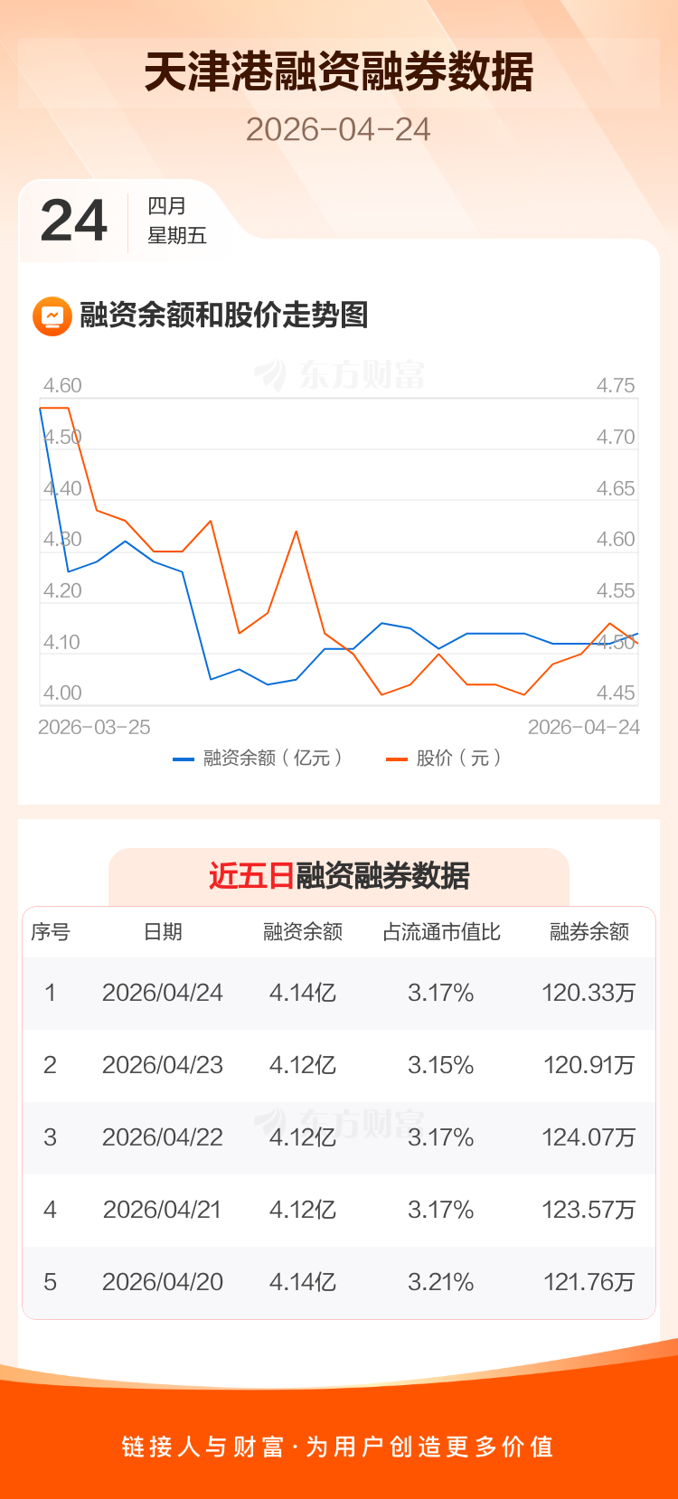 交易所最新数据显示,天津港于2026年4月24日获融资买入924.97万元,融资偿还746.40万元,当日融资净买入178.57万元。目前,该股融资余额4.14亿,占流通市值比例为3.17%。