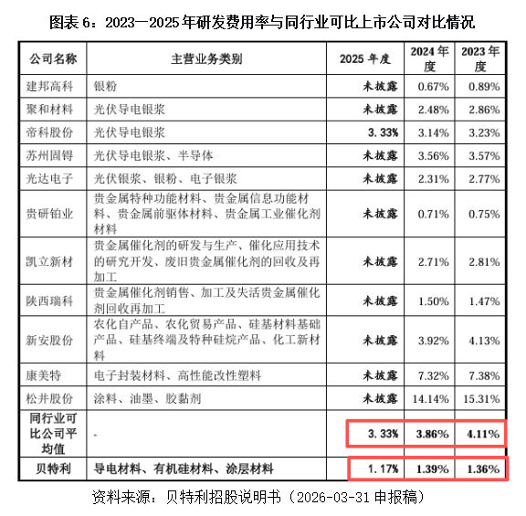 面对去银化浪潮,贝特利在第一轮问询回复中宣称,公司早在2009年便前瞻性地启动了“粉浆一体化”研发战略,布局银包铜粉、铜粉、铜浆等技术路线。然而,在TOP Con电池领域,其银包铜产品“尚未形成销售”,仍停留在测试阶段。2025年的研发费用率仅为1.17%,却要支撑从银粉到铜粉、铜浆的技术转型——这一解释略显牵强。