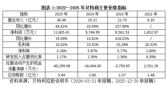 招股书显示,2022—2025年(下称“报告期”),贝特利营收从6.35亿元飙升至36.46亿元,增长近五倍,年复合增长率高达79.07%,其中2023年同比增速达257.89%;净利润从1652.97万元增至1.16亿元,年复合增长率达91.48%,2023年更是暴涨418.01%。