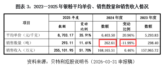疑问一:银粉业务的真实盈利成色几何?剔除银价上涨这一被动因素后,贝特利银粉的实际加工毛利已大幅缩水。单位加工费持续走低,直接反映出市场竞争加剧和公司议价能力的削弱。一旦银价波动或加工费进一步下滑,该公司的利润将面临断崖式下滑风险。营收暴增近五倍的光鲜数字背后,是加工费持续走低、毛利逼近盈亏线的残酷现实——所谓的高增长,不过是银价上涨堆砌的“虚火”,剔除价格泡沫后,该公司的真实盈利基础暴露出脆弱性。