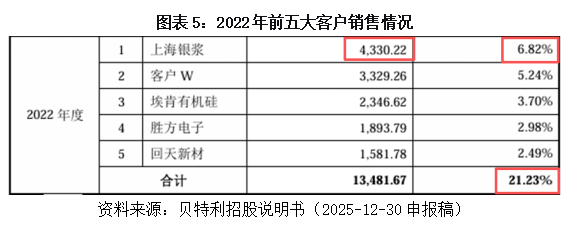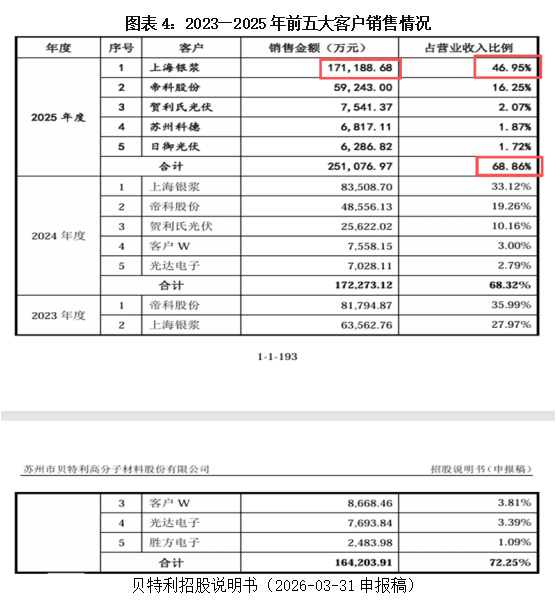 从竞争格局看,贝特利的客户集中度较高。报告期内,该公司前五大客户销售占比从21.23%飙升至68.32%。其中,对上海银浆科技有限公司(还包括上海银浆新材料有限公司及通过中间商采购的金额)的销售收入从2022年的0.43亿元增至2025年的17.12亿元,收入占比从6.82%升至46.95%。更值得警惕的是,这三大客户的主营业务均为光伏导电浆料,而贝特利自身也布局了导电浆料业务,与下游大客户存在业务竞争风险。