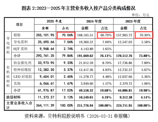 贝特利最初以硅胶按键涂层材料起家,2010年前后凭借技术迁移优势切入导电材料领域。目前,导电材料已成为该公司的核心板块,主要产品包括银粉、导电浆料和HJT浆料。其中,银粉对营收贡献最大,如图表2所示,2023—2025年,其销售额占主营业务收入的比例分别为70.30%、66.79%和70.06%。