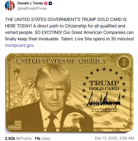 2025年9月,项目在特朗普签署“黄金卡”行政令后正式设立;同年12月开始受理申请。
