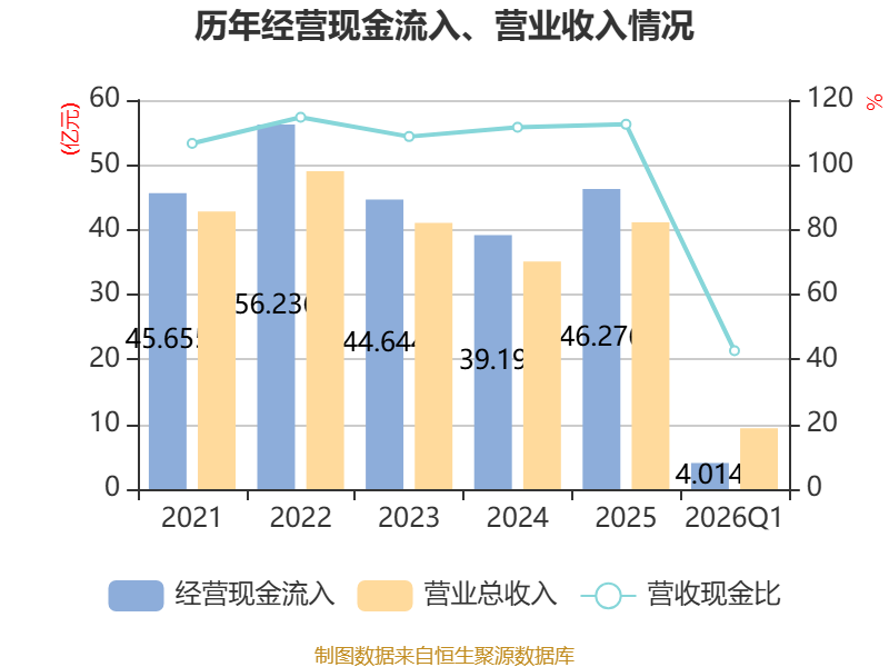 截至2026年一季度末,公司经营活动现金流净额为5515.27万元,同比下降80.09%;筹资活动现金流净额-169.23万元,同比减少167.33万元;投资活动现金流净额1.06亿元,上年同期为-3.66亿元。