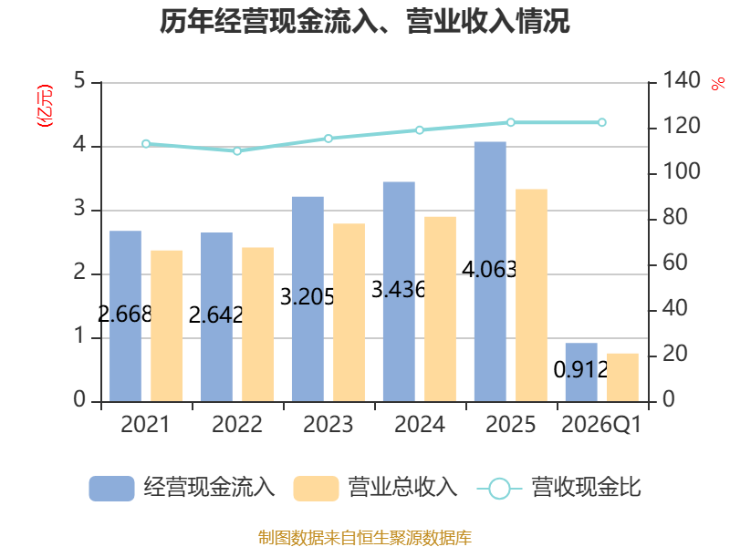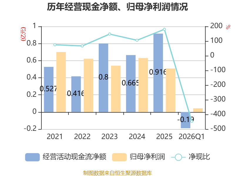 截至2026年一季度末,公司经营活动现金流净额为-1901.94万元,同比减少463.8万元;筹资活动现金流净额141.6万元,同比增加1200.02万元;投资活动现金流净额-1.25亿元,上年同期为2.36亿元。