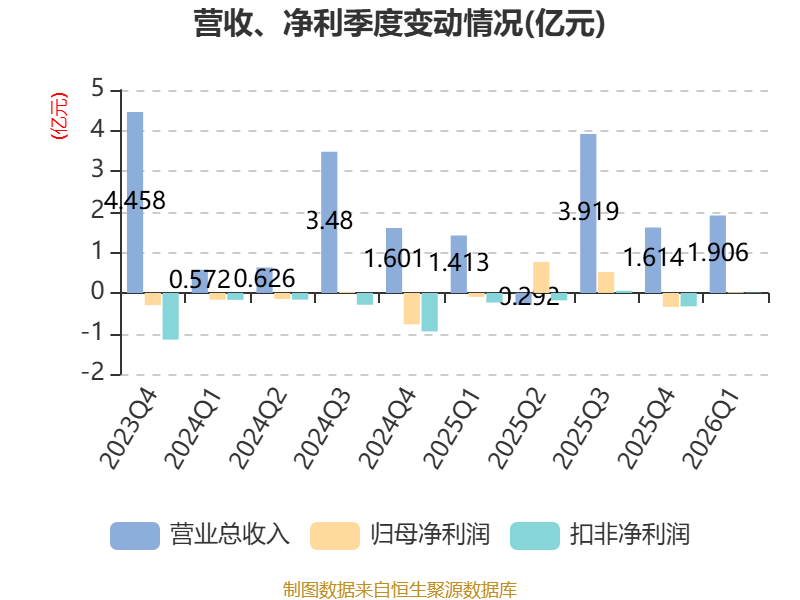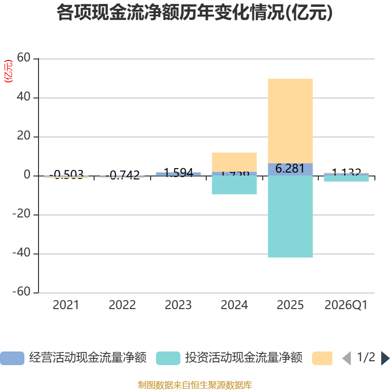 截至2026年一季度末,公司经营活动现金流净额为1.13亿元,同比增加1.19亿元;筹资活动现金流净额3166.51万元,同比减少9.98亿元;投资活动现金流净额-3.12亿元,上年同期为-10.52亿元。
