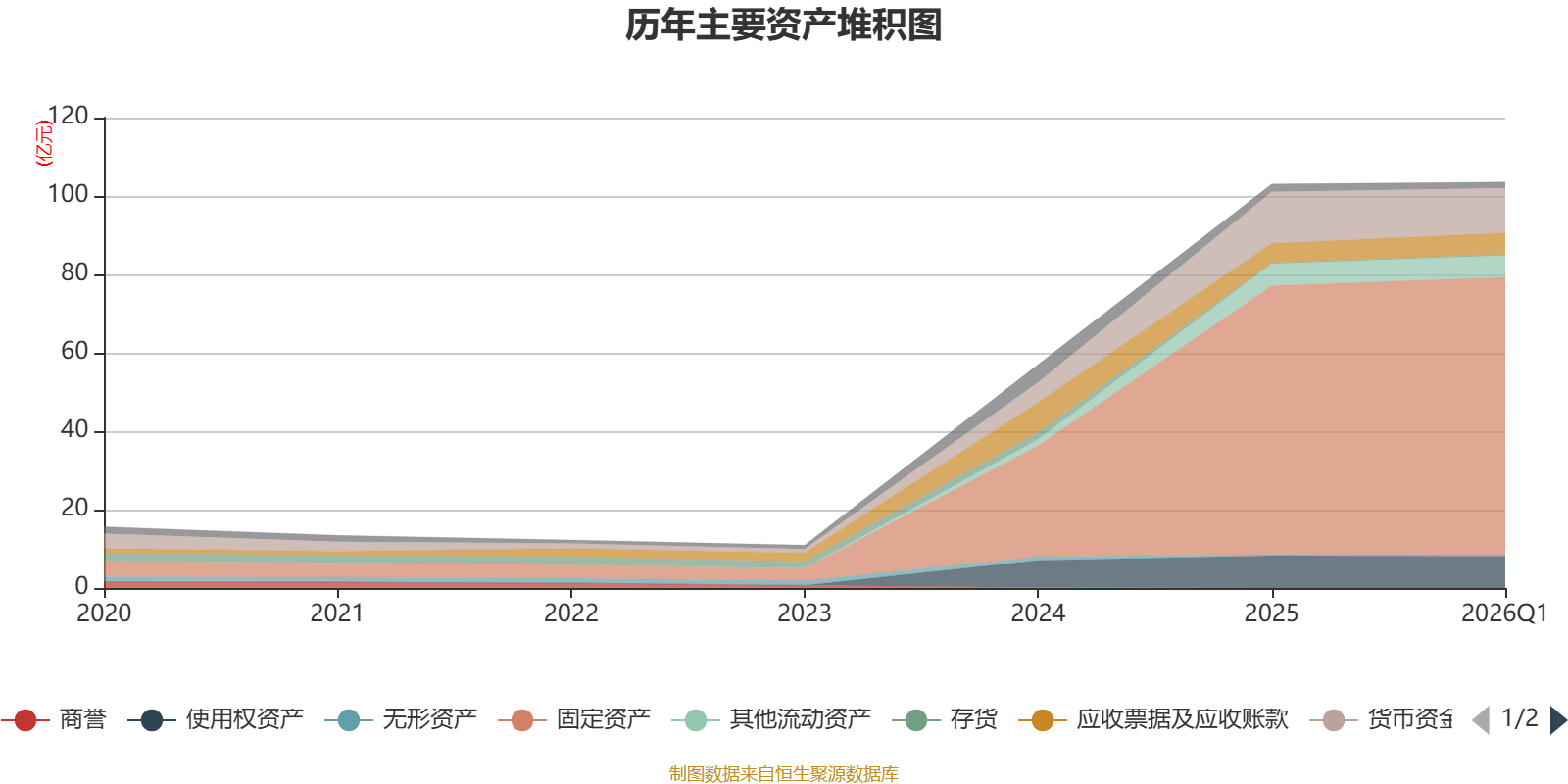 资产重大变化方面,截至2026年一季度末,公司固定资产较上年末增加3.31%,占公司总资产比重上升1.87个百分点;货币资金较上年末减少12.7%,占公司总资产比重下降1.67个百分点;在建工程合计较上年末减少90.68%,占公司总资产比重下降1.17个百分点;预付款项较上年末增加1086.6%,占公司总资产比重上升0.7个百分点。