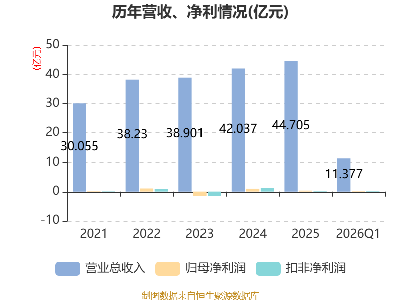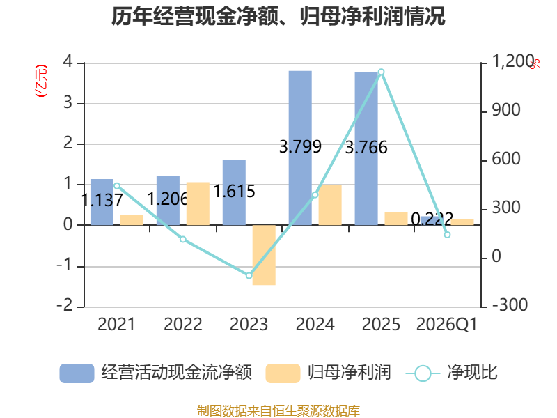 截至2026年一季度末,公司经营活动现金流净额为2220.86万元,同比下降48.7%;筹资活动现金流净额1.05亿元,同比减少460.2万元;投资活动现金流净额-1.07亿元,上年同期为-1.22亿元。