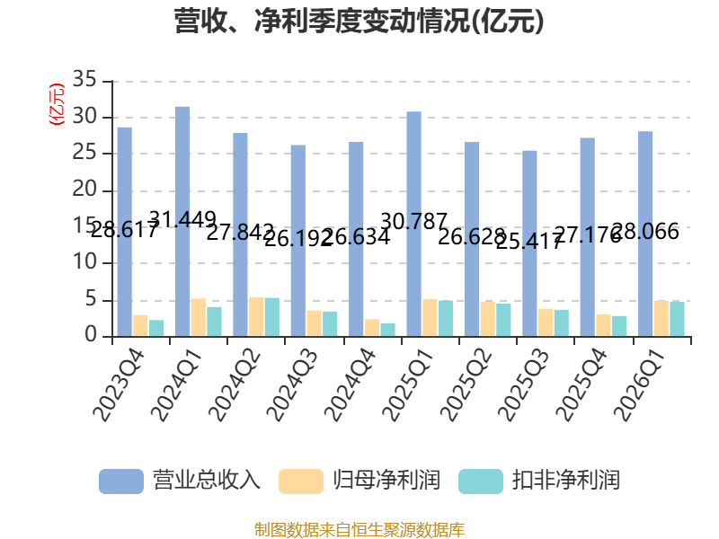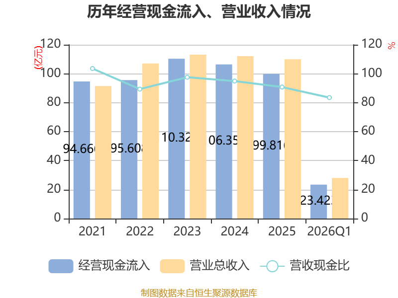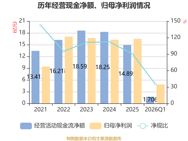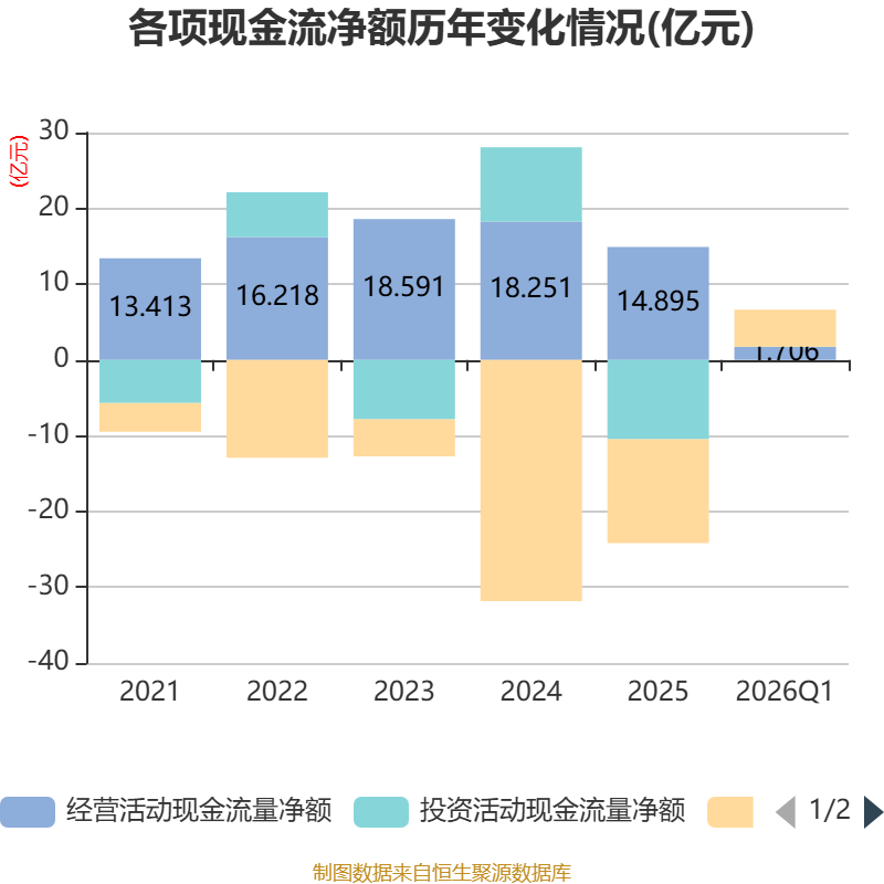 截至2026年一季度末,公司经营活动现金流净额为1.71亿元,同比下降46.19%;筹资活动现金流净额4.87亿元,同比增加5.12亿元;投资活动现金流净额543.93万元,上年同期为-2135.48万元。
