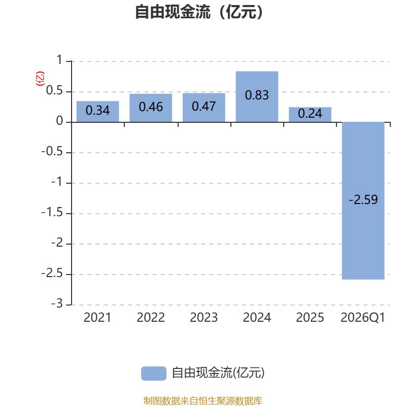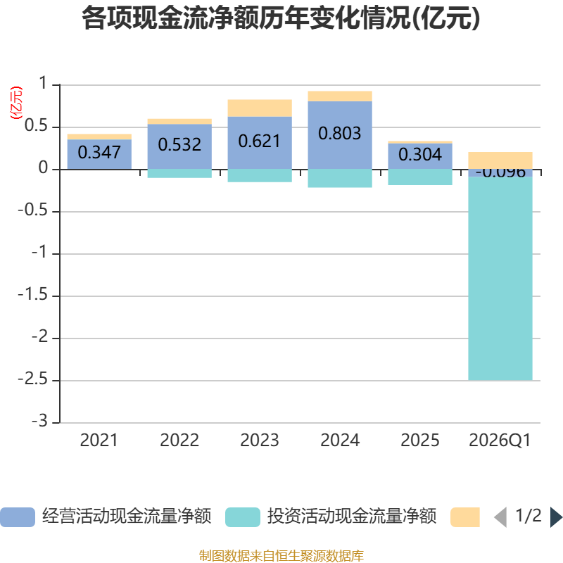 截至2026年一季度末,公司经营活动现金流净额为-963.66万元,同比增加762.91万元;筹资活动现金流净额1992.02万元,同比增加1939.38万元;投资活动现金流净额-2.41亿元,上年同期为-1.88亿元。
