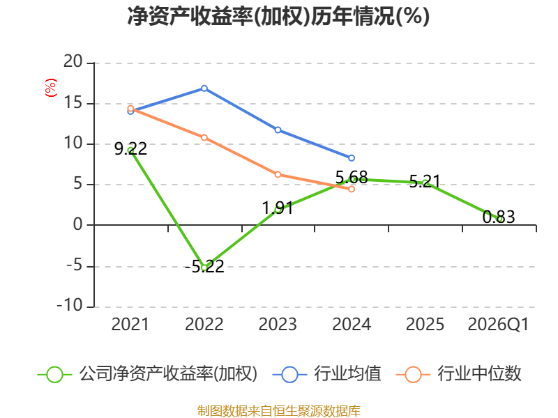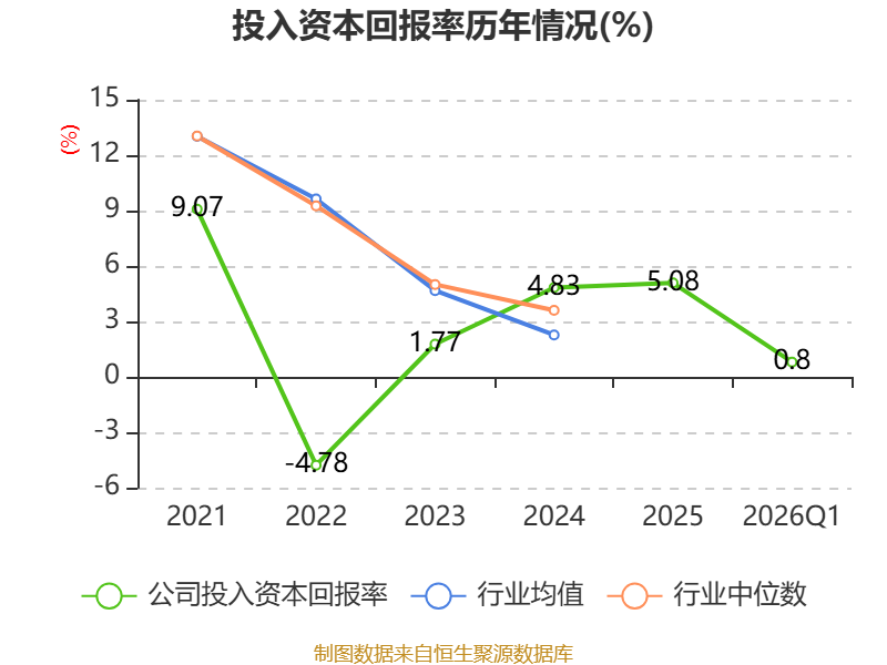 盈利能力方面, 2026年一季度公司加权平均净资产收益率为0.83%,同比下降1.86个百分点。公司2026年第一季度投入资本回报率为0.8%,较上年同期下降1.86个百分点。