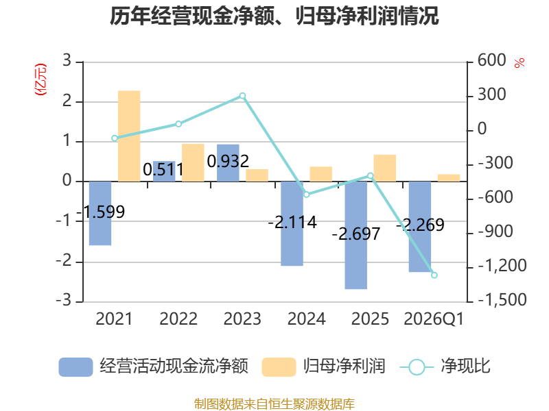 截至2026年一季度末,公司经营活动现金流净额为-2.27亿元,同比减少1.68亿元;筹资活动现金流净额3.94亿元,同比增加2亿元;投资活动现金流净额-9378.73万元,上年同期为-5315.22万元。