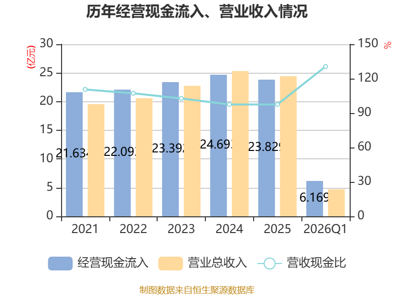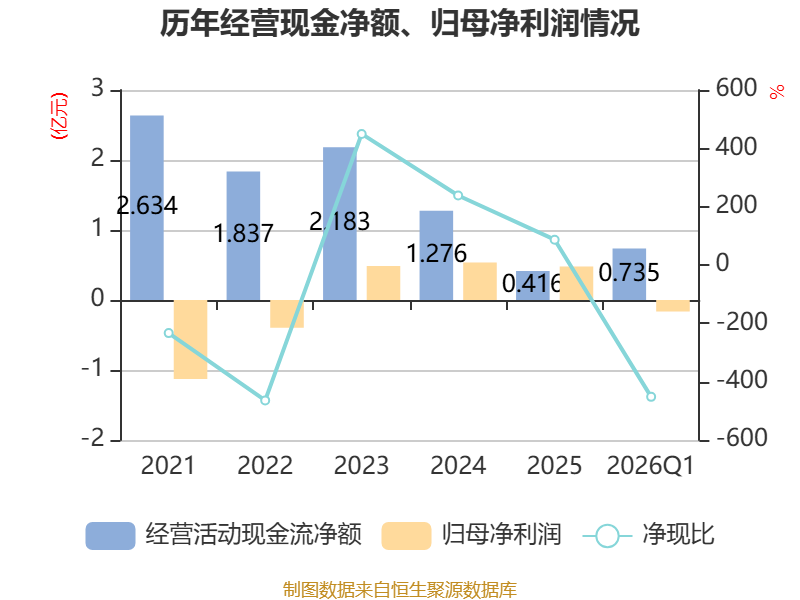 截至2026年一季度末,公司经营活动现金流净额为7348.96万元,同比增长11.66%;筹资活动现金流净额4660.57万元,同比增加3825.64万元;投资活动现金流净额-2924.64万元,上年同期为-2661.67万元。
