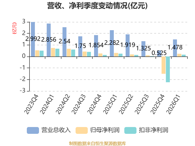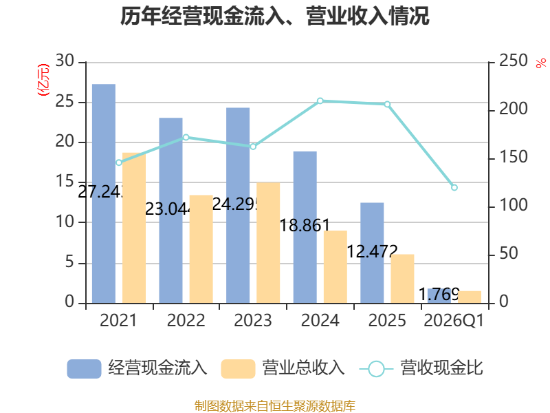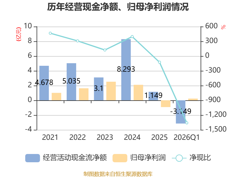 截至2026年一季度末,公司经营活动现金流净额为-3.15亿元,同比减少4.23亿元;筹资活动现金流净额4848.22万元,同比增加4317.19万元;投资活动现金流净额1.28亿元,上年同期为-8313.45万元。