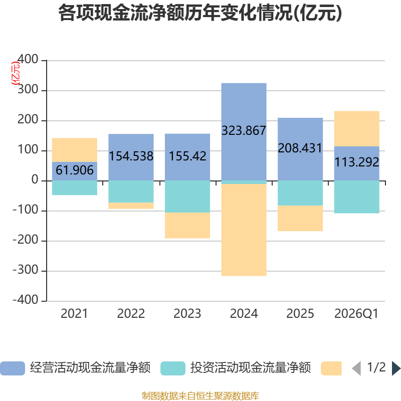 截至2026年一季度末,公司经营活动现金流净额为113.29亿元,同比增长762.3%;筹资活动现金流净额117.46亿元,同比增加109.17亿元;投资活动现金流净额-109.3亿元,上年同期为-7.55亿元。