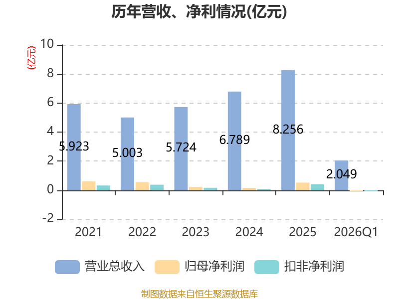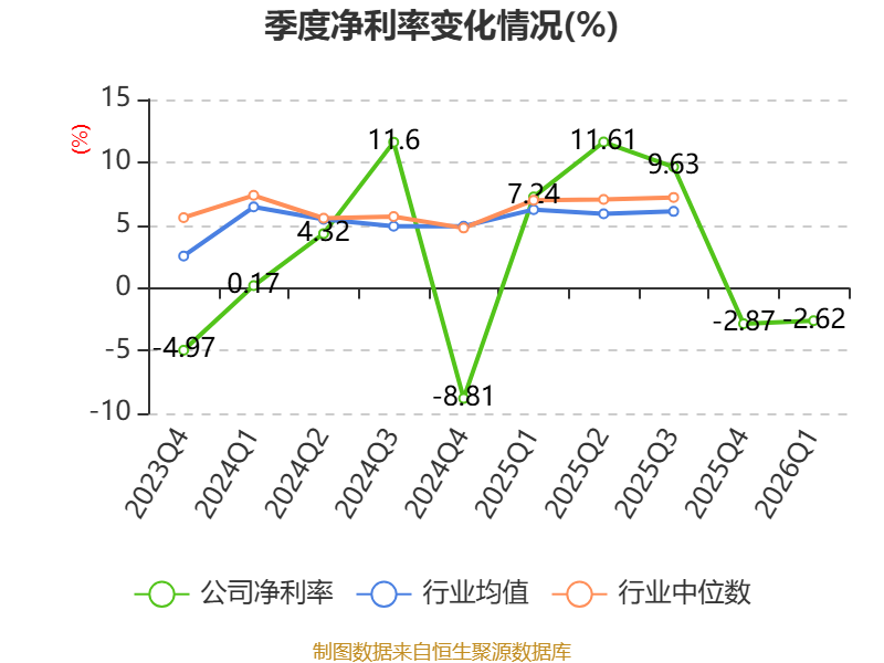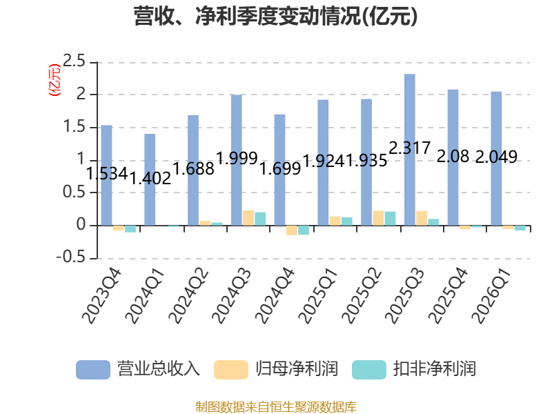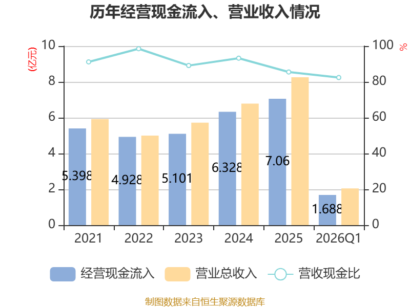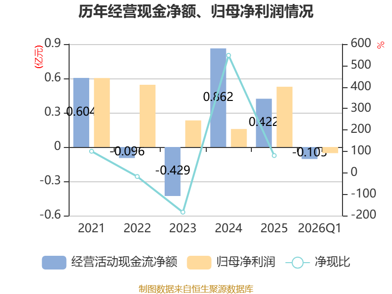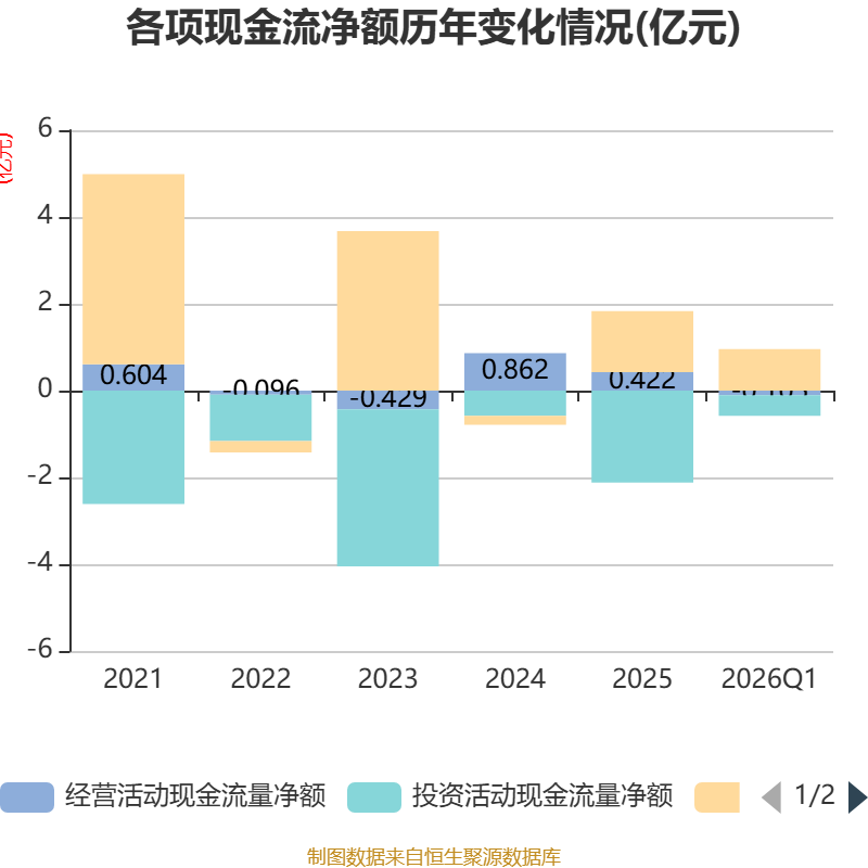 截至2026年一季度末,公司经营活动现金流净额为-1047.96万元,同比增加996.63万元;筹资活动现金流净额9537.1万元,同比增加2746.56万元;投资活动现金流净额-4745.5万元,上年同期为-3475.38万元。