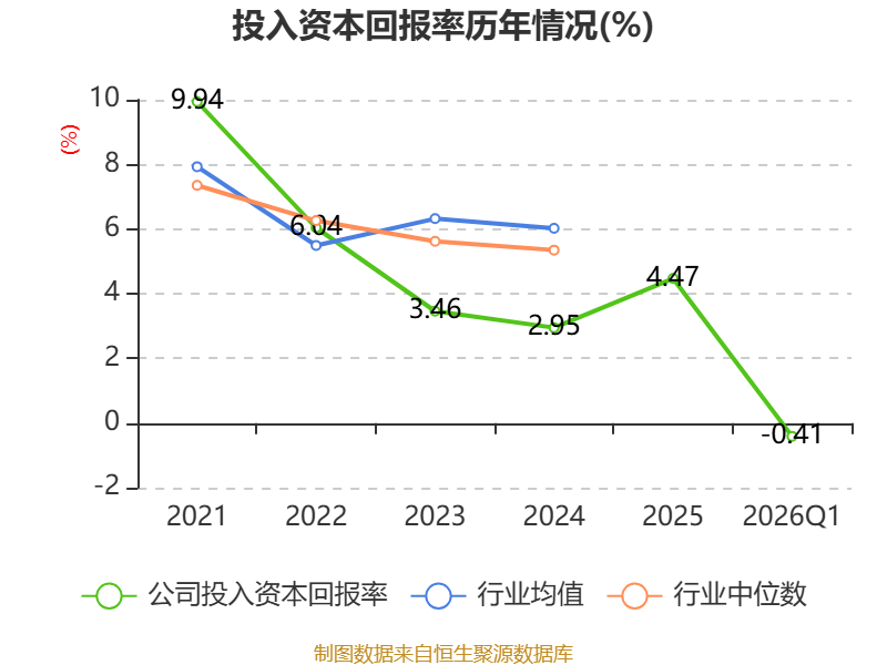 盈利能力方面, 2026年一季度公司加权平均净资产收益率为-38.15%,同比下降39.59个百分点。公司2026年第一季度投入资本回报率为-0.41%,较上年同期下降1.9个百分点。