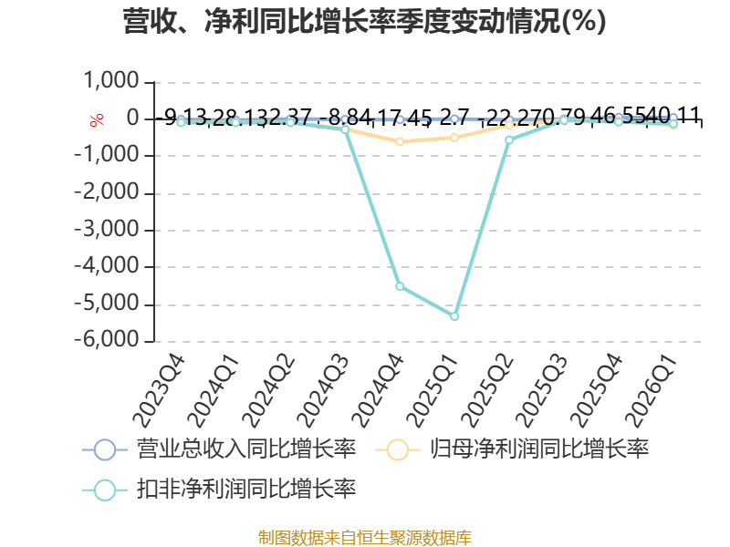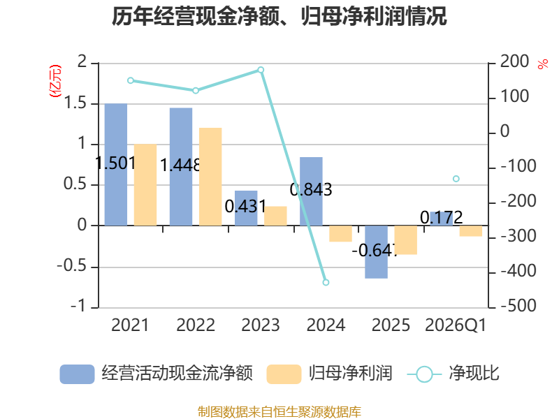 截至2026年一季度末,公司经营活动现金流净额为1717.57万元,同比增加7983.07万元;筹资活动现金流净额0元,与同期相比基本不变;投资活动现金流净额2018.2万元,上年同期为8886.87万元。