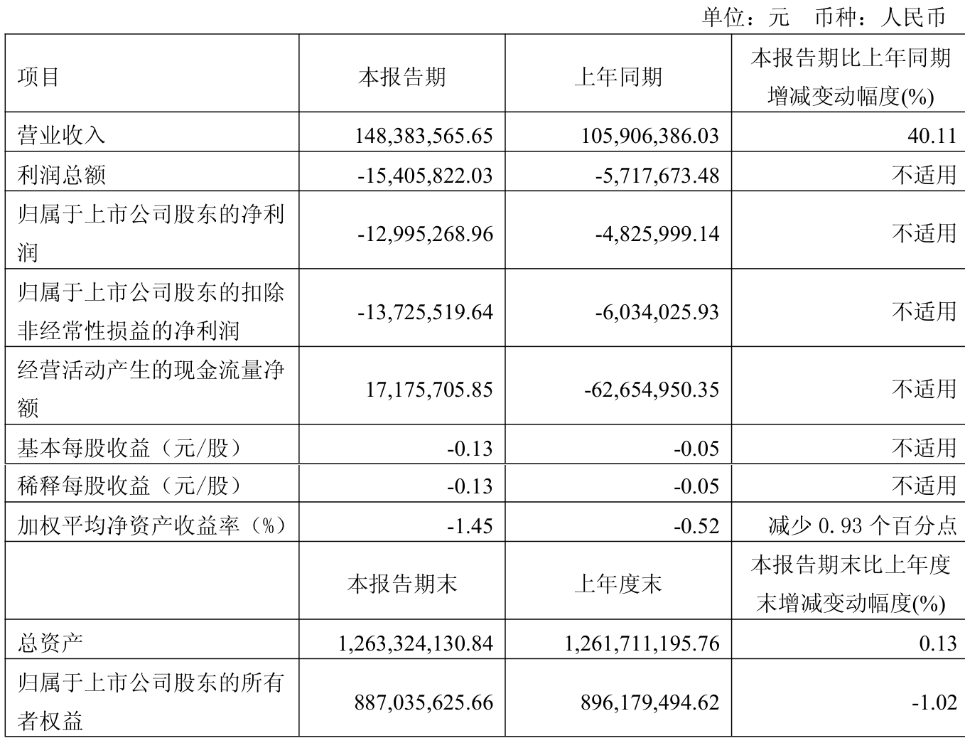 中证智能财讯阿科力(603722)4月25日披露2026年第一季度报告。公司实现营业总收入1.48亿元,同比增长40.11%;归母净利润亏损1299.53万元,上年同期亏损482.6万元;扣非净利润亏损1372.55万元,上年同期亏损603.4万元;经营活动产生的现金流量净额为1717.57万元,上年同期为-6265.5万元;报告期内,阿科力基本每股收益为-0.13元,加权平均净资产收益率为-1.45%。