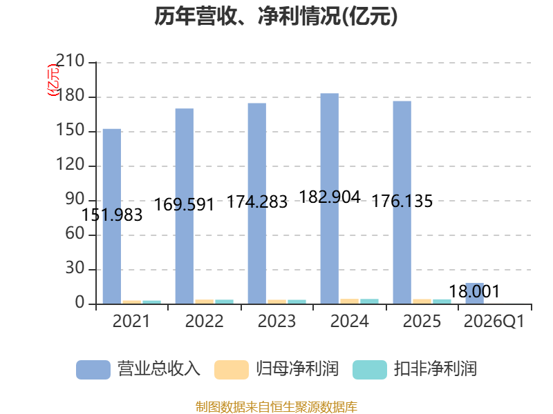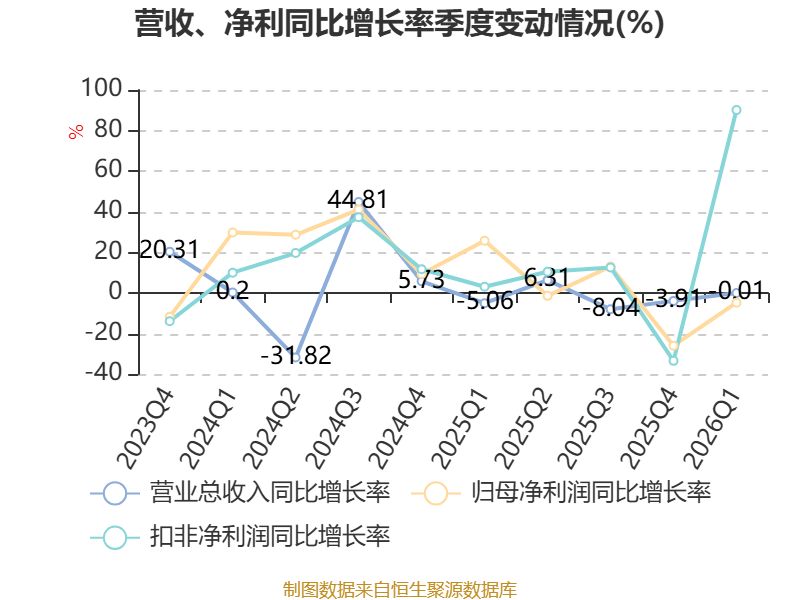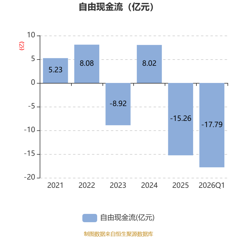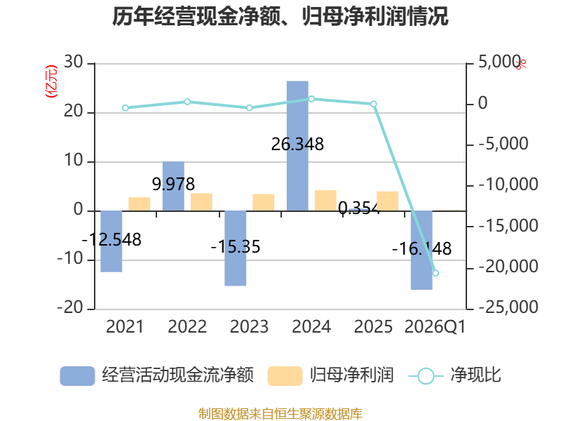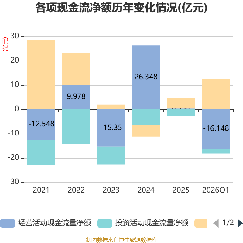 截至2026年一季度末,公司经营活动现金流净额为-16.15亿元,同比增加6.83亿元;筹资活动现金流净额12.52亿元,同比增加8601.74万元;投资活动现金流净额-2.03亿元,上年同期为-1.48亿元。