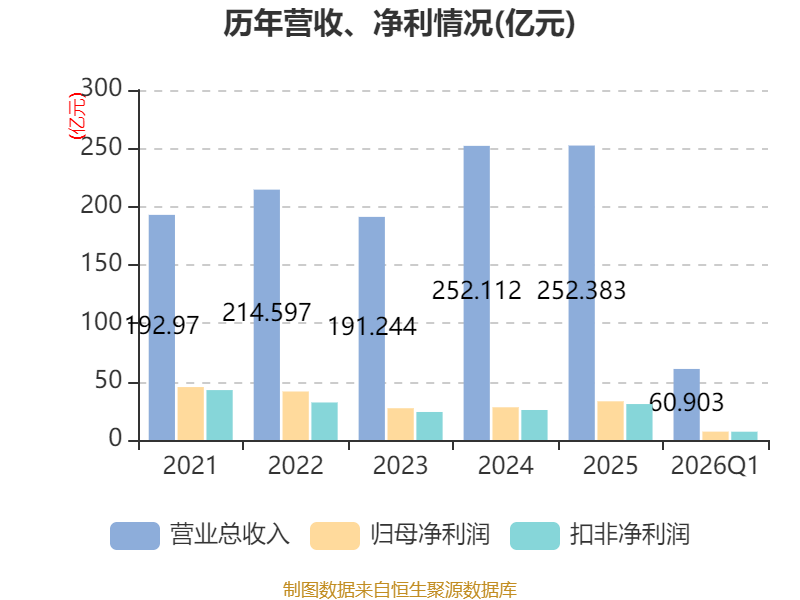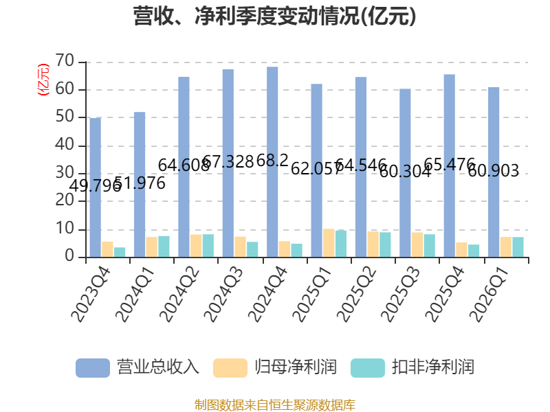 截至2026年一季度末,公司经营活动现金流净额为10.83亿元,同比增长19.5%;筹资活动现金流净额-4.71亿元,同比减少5013.84万元;投资活动现金流净额-4.84亿元,上年同期为-2.6亿元。