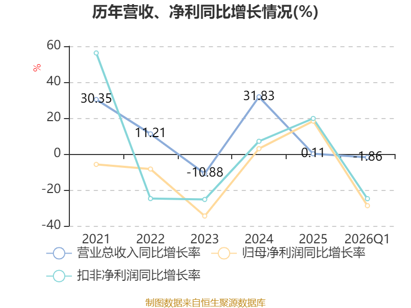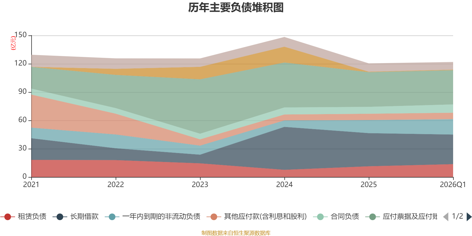 负债重大变化方面,截至2026年一季度末,公司长期借款较上年末减少10.78%,占公司总资产比重下降1.02个百分点;一年内到期的非流动负债较上年末增加17.49%,占公司总资产比重上升0.51个百分点;租赁负债较上年末增加19.81%,占公司总资产比重上升0.48个百分点;应付职工薪酬较上年末减少59.45%,占公司总资产比重下降0.36个百分点。