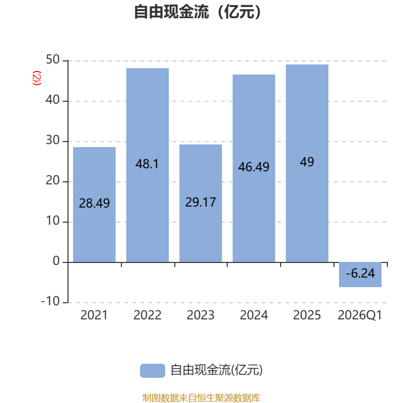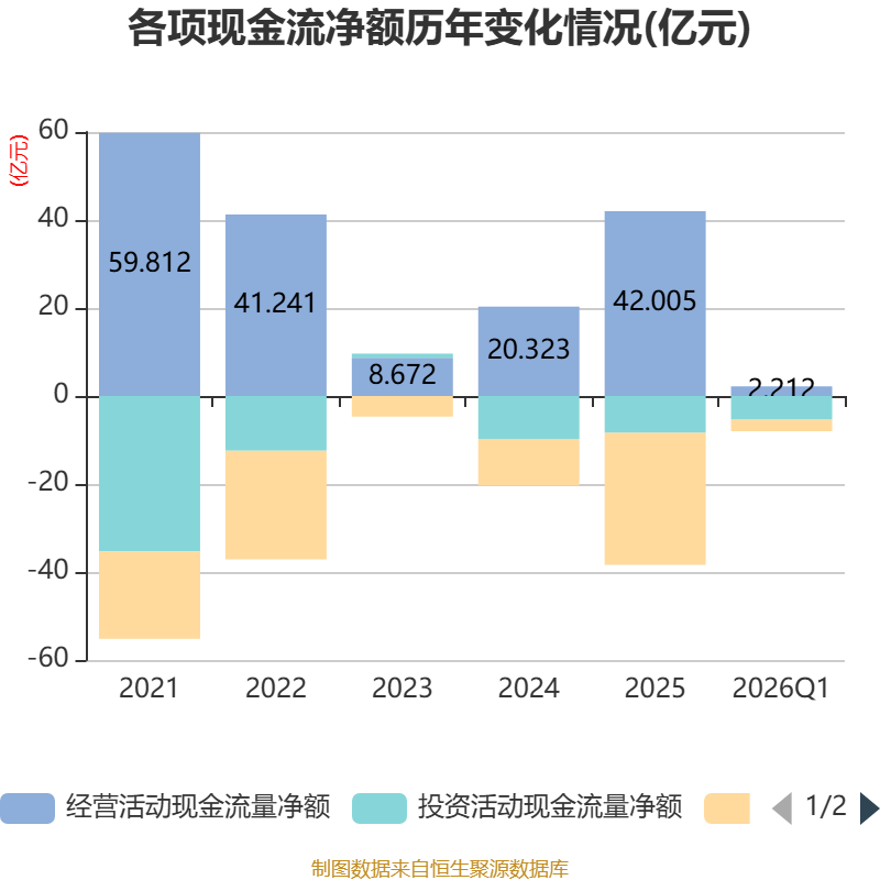 截至2026年一季度末,公司经营活动现金流净额为2.21亿元,同比增加3.14亿元;筹资活动现金流净额-2.61亿元,同比减少4678.71万元;投资活动现金流净额-5.38亿元,上年同期为-2.04亿元。