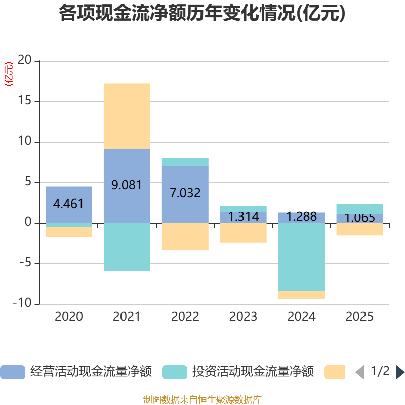 截至2025年,公司经营活动现金流净额为1.06亿元,同比下降17.35%;筹资活动现金流净额-1.58亿元,同比减少5350.34万元;投资活动现金流净额1.32亿元,上年同期为-8.38亿元。
