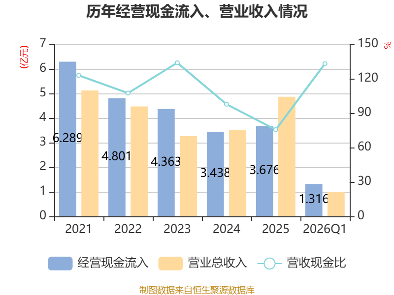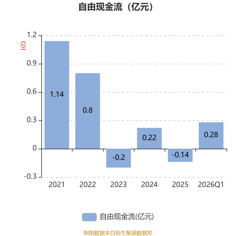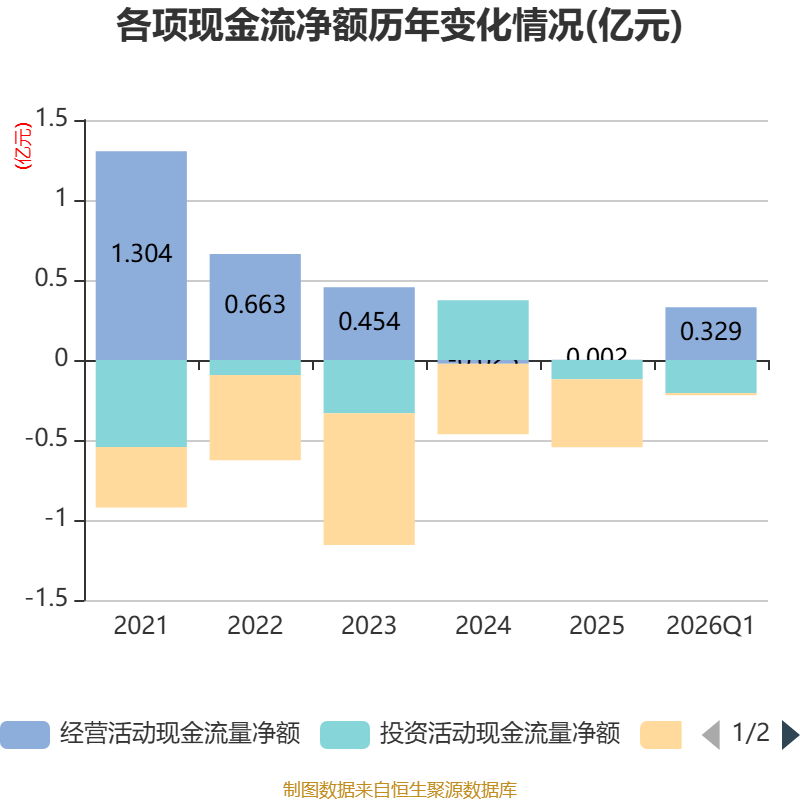 截至2026年一季度末,公司经营活动现金流净额为3285.12万元,同比增加5143.62万元;筹资活动现金流净额-147.15万元,同比增加74.22万元;投资活动现金流净额-2059.17万元,上年同期为-203.7万元。