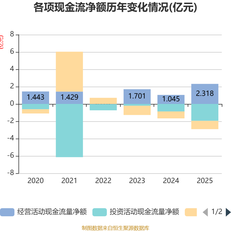 截至2025年,公司经营活动现金流净额为2.32亿元,同比增长121.73%;筹资活动现金流净额-9604.37万元,同比减少1625.6万元;投资活动现金流净额-1.95亿元,上年同期为-8670.16万元。