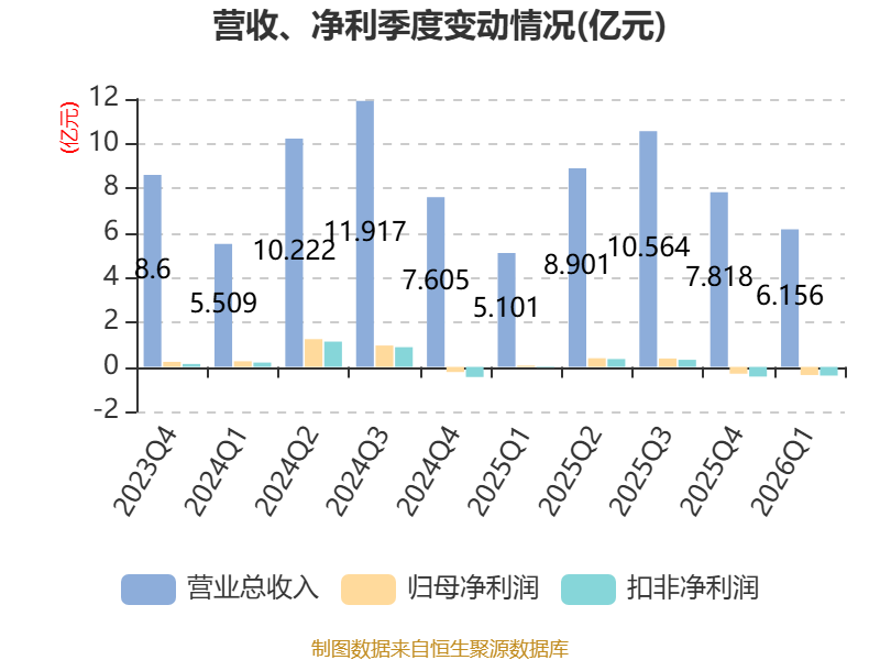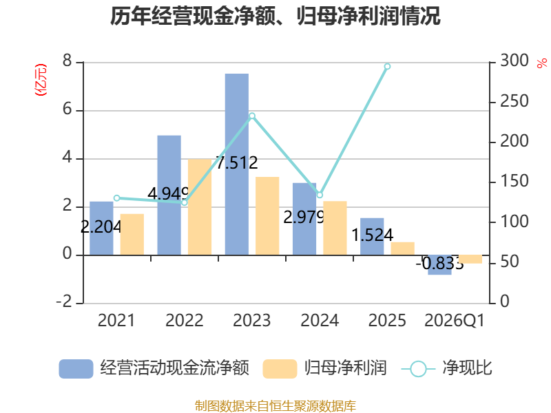 截至2026年一季度末,公司经营活动现金流净额为-8329.3万元,同比增加1.17亿元;筹资活动现金流净额-2712.41万元,同比增加9130.72万元;投资活动现金流净额5694.61万元,上年同期为8312.42万元。