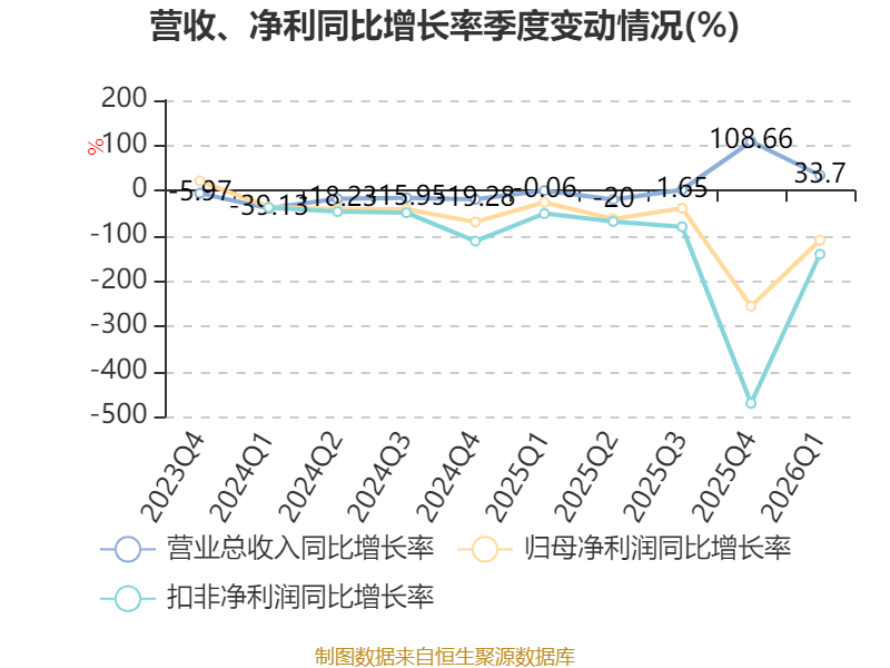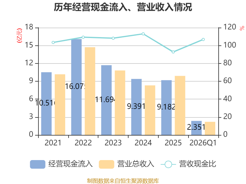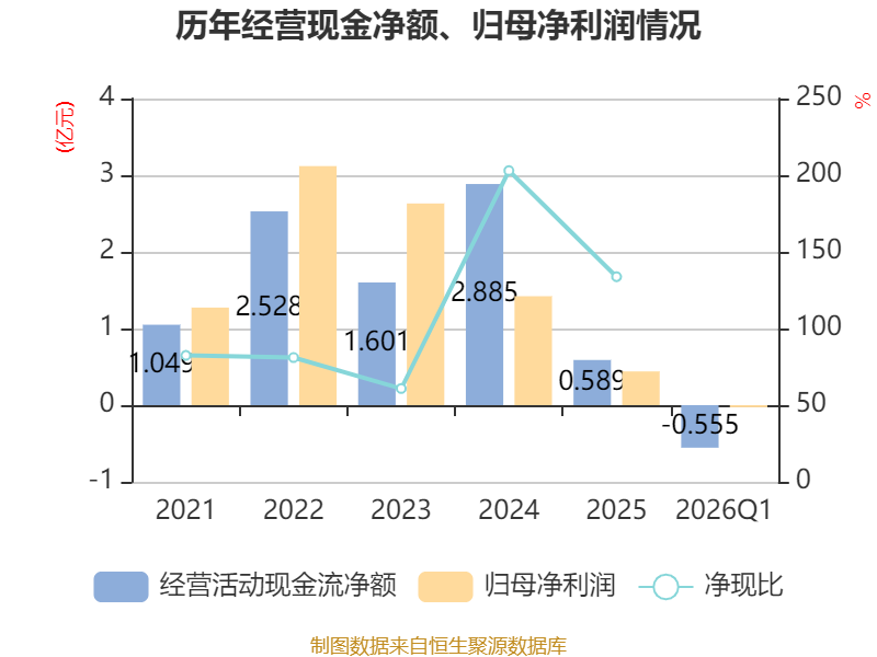 截至2026年一季度末,公司经营活动现金流净额为-5549.27万元,同比减少1.02亿元;筹资活动现金流净额4867.45万元,同比增加7693.83万元;投资活动现金流净额1.3亿元,上年同期为17.21亿元。