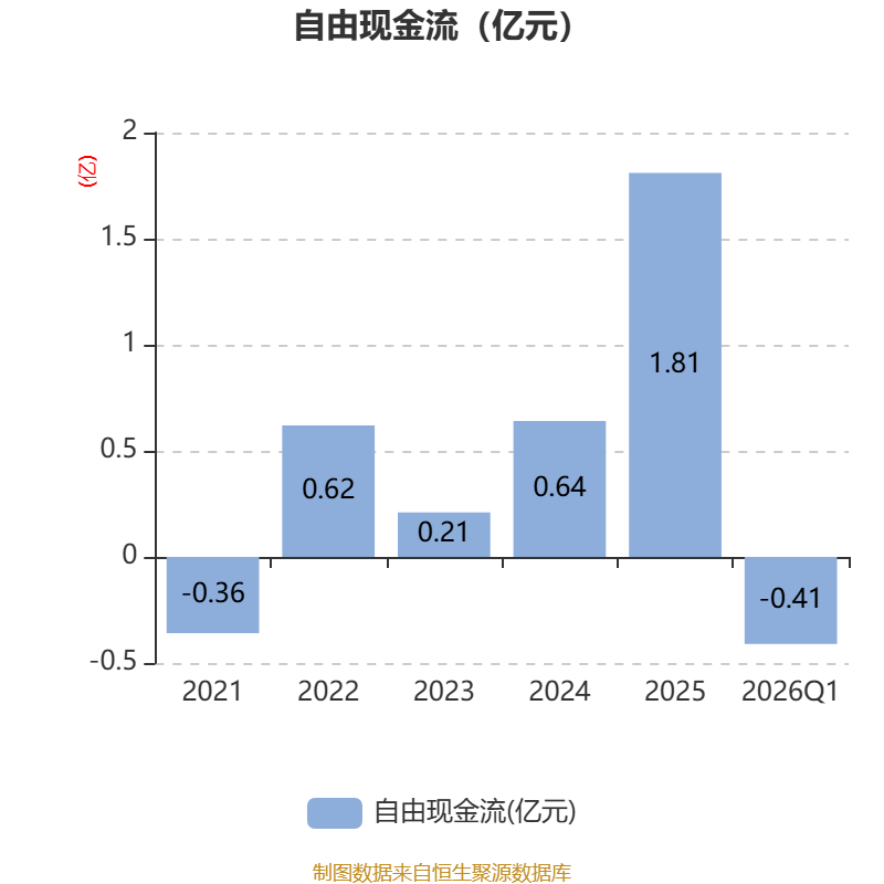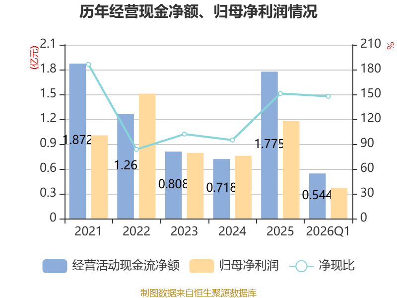 截至2026年一季度末,公司经营活动现金流净额为5444.25万元,同比增长224.52%;筹资活动现金流净额3020.85万元,同比增加3720.37万元;投资活动现金流净额-6531.87万元,上年同期为-1089万元。