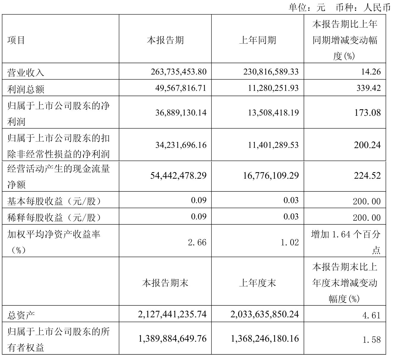 中证智能财讯三祥新材(603663)4月25日披露2026年第一季度报告。公司实现营业总收入2.64亿元,同比增长14.26%;归母净利润3688.91万元,同比增长173.08%;扣非净利润3423.17万元,同比增长200.24%;经营活动产生的现金流量净额为5444.25万元,同比增长224.52%;报告期内,三祥新材基本每股收益为0.09元,加权平均净资产收益率为2.66%。