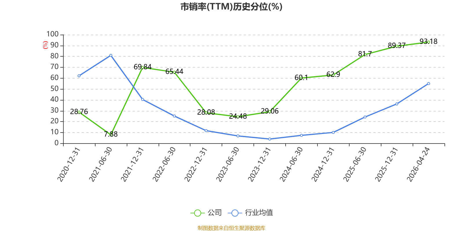 以4月24日收盘价计算,三祥新材目前市盈率(TTM)约为146.12倍,市净率(LF)约14.82倍,市销率(TTM)约17.18倍。