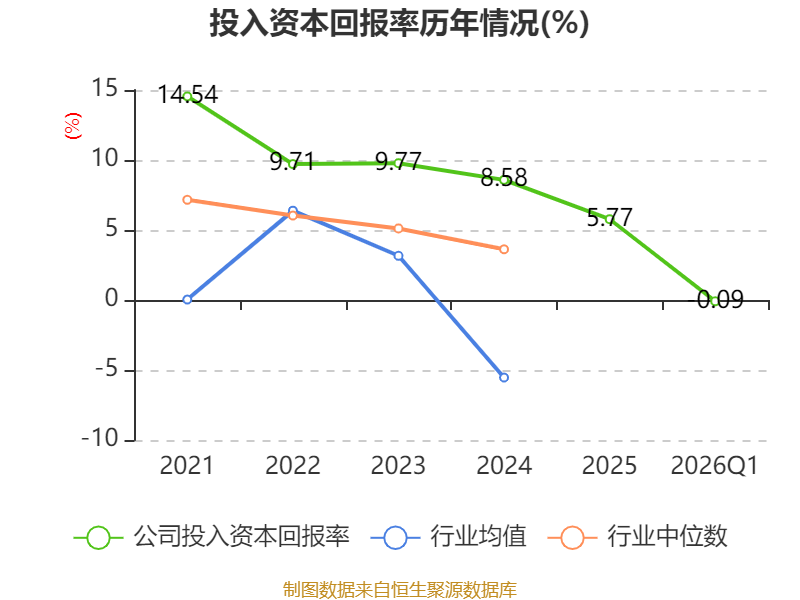 盈利能力方面, 2026年一季度公司加权平均净资产收益率为-0.04%,同比下降1.91个百分点。公司2026年第一季度投入资本回报率为-0.09%,较上年同期下降1.72个百分点。