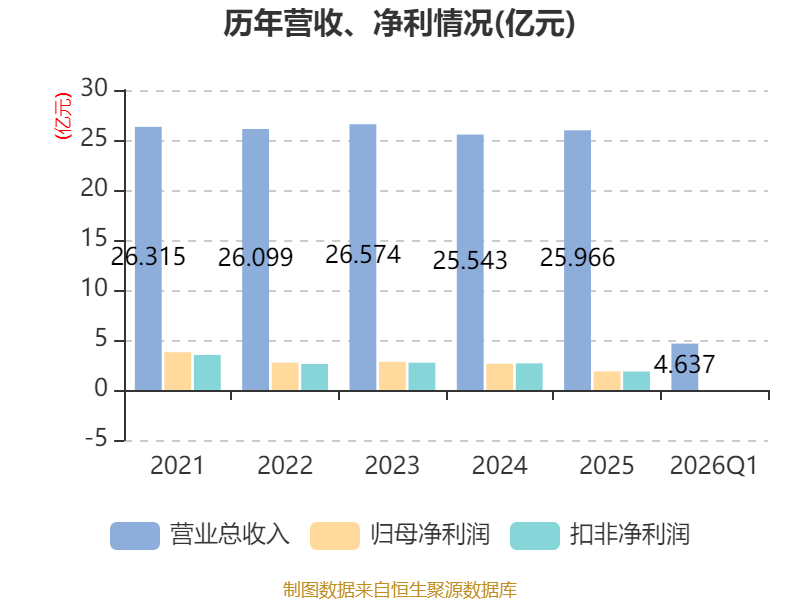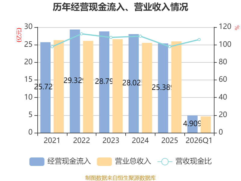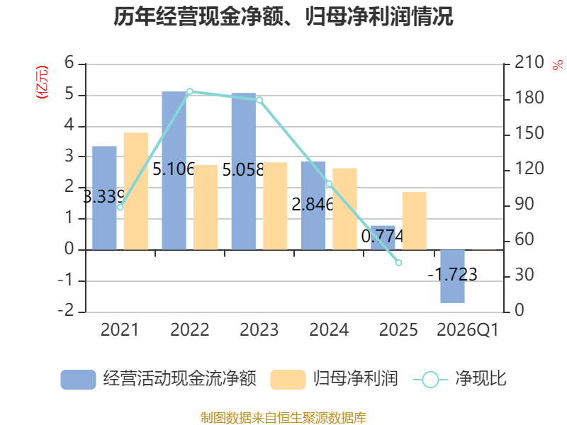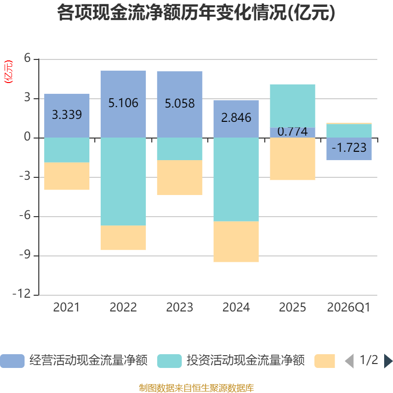 截至2026年一季度末,公司经营活动现金流净额为-1.72亿元,同比减少3.04亿元;筹资活动现金流净额839.65万元,同比增加1.7亿元;投资活动现金流净额1.04亿元,上年同期为2.46亿元。