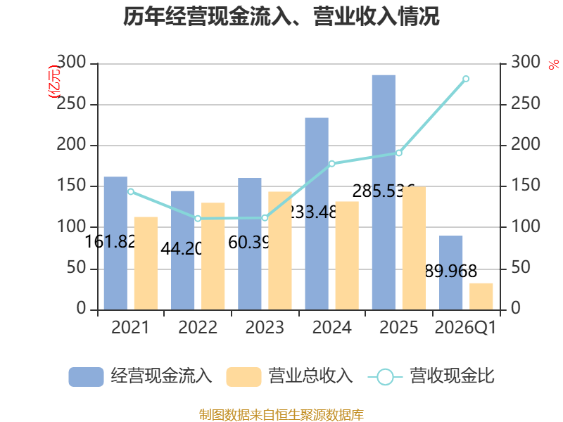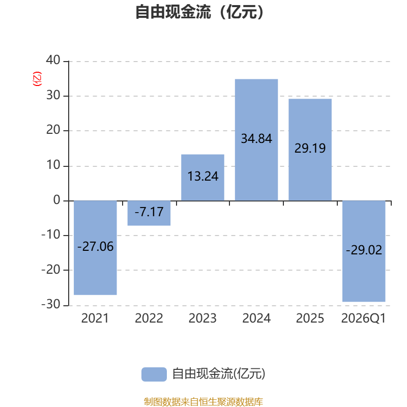 截至2026年一季度末,公司经营活动现金流净额为-13.91亿元,同比减少2.73亿元;筹资活动现金流净额-8424.99万元,同比增加1.03亿元;投资活动现金流净额-11.06亿元,上年同期为-2.07亿元。