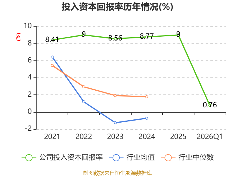 盈利能力方面, 2026年一季度公司加权平均净资产收益率为1.02%,同比上升0.11个百分点。公司2026年第一季度投入资本回报率为0.76%,较上年同期上升0.05个百分点。