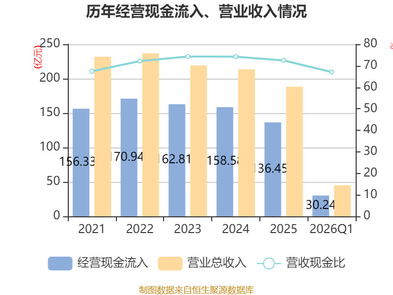 截至2026年一季度末,公司经营活动现金流净额为-4.5亿元,同比减少1.51亿元;筹资活动现金流净额3807.13万元,同比减少1.13亿元;投资活动现金流净额-2.85亿元,上年同期为-4.75亿元。